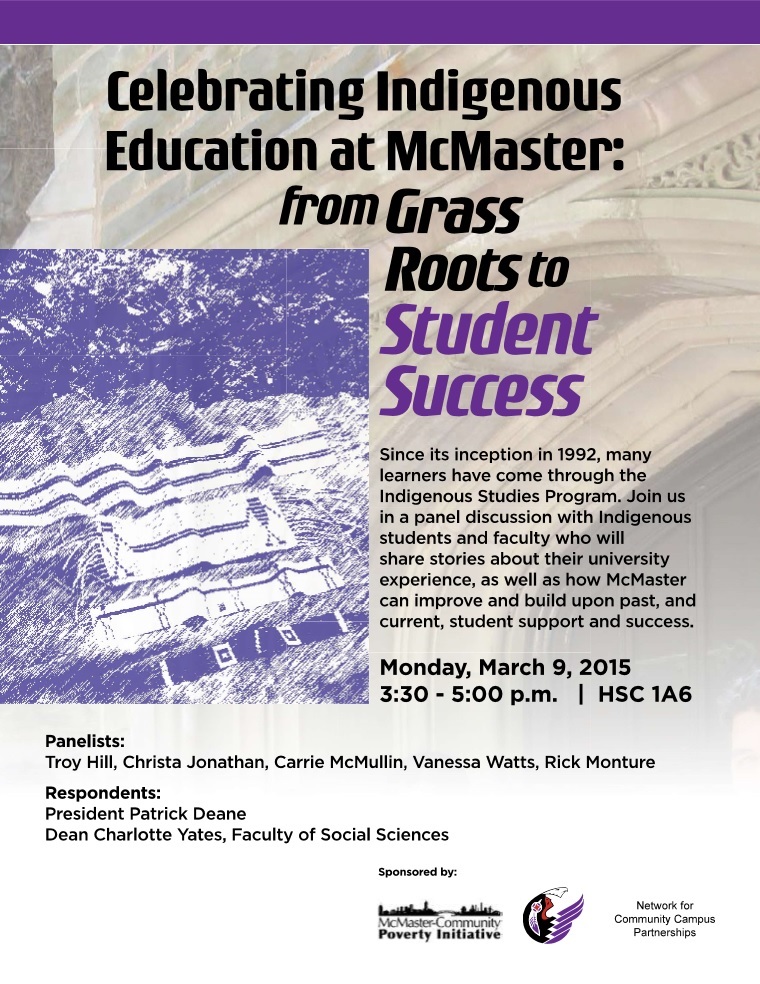 MCPI News: Celebrating Indigenous Education & Future Directions at McMaster from Grass Roots to Student Success. 3:30pm-5:00pm | HSC 1A6 Mar 09, 2015 Celebrating Indigenous Education & Future Directions at McMaster event poster.