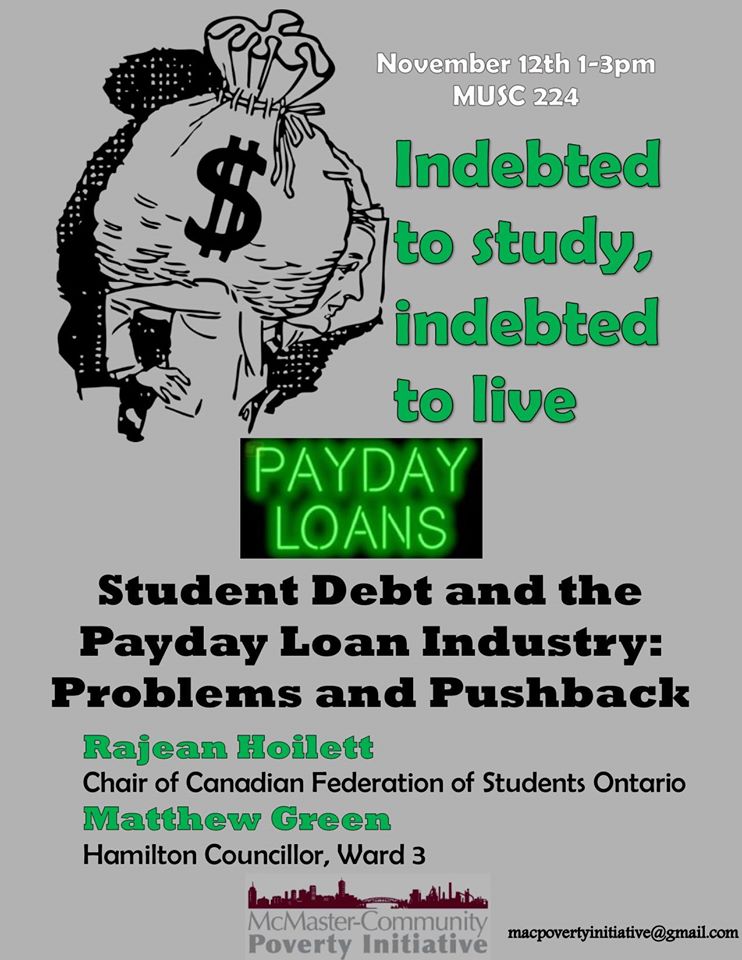 MCPI News: Indebted to Study, Indebted to Live Student Debt and the Payday Loan Industry: Problems and Pushback. MUSC 224 Nov 12, 2015 Indebted to Study, Indebted to Live event poster.
